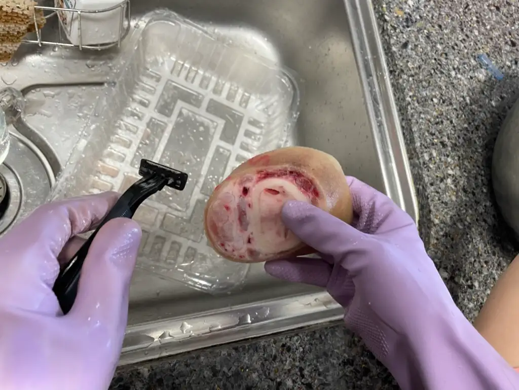 강아지 우족을 만들어서 건강하고 맛있게 먹이기 위해서는 우족에 붙어 있는 털을 깔끔하게 제거해 주어야 합니다. 의외로 털이 많이 붙어 있기 때문에 꼭 일회용 면도기를 이용해서 깨끗해질 때까지 밀어주었습니다. 면도날에 털이 계속 엉겨 붙기 때문에 물에 여러번 헹궈줘야 조금 더 빨리 털 제거를 마무리할 수 있습니다.