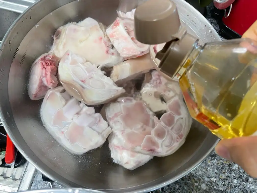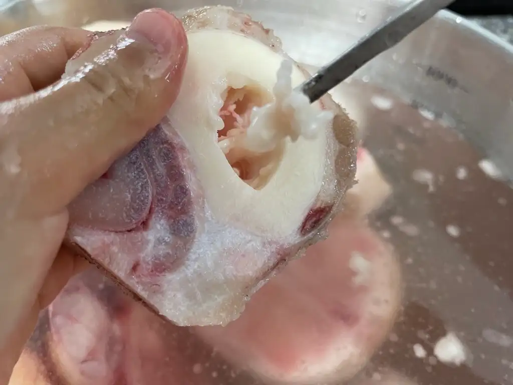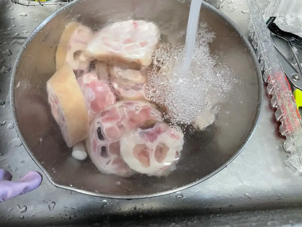 한우 우족을 물에 담그면 벌건 핏물이 나오기 시작합니다. 누군가는 10시간 이상 핏물을 빼야 한다고 하고 또 다른 사람은 핏물에도 영양분이 있으니 그대로 건조해도 된다고 하였습니다. 그래서 저는 절충해서 1시간 정도만 물속에 담가 놓고 핏물을 제거하였습니다. 핏물과 지방 기름이 계속해서 나오기 때문에 10분마다 한 번씩 물을 갈아주면서 최대한 깨끗하게 손질을 하려고 하였습니다.