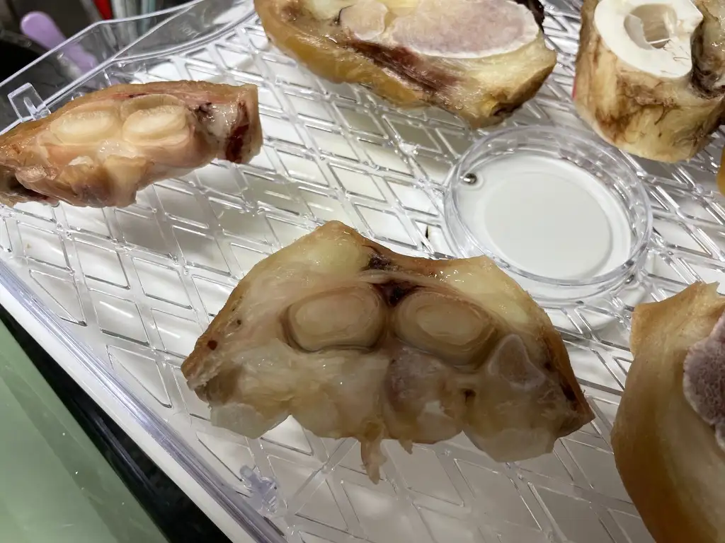 한우 우족에는 엄청난 지방들이 자리 잡고 있습니다. 강아지 우족이기 때문에 좀 더 꼼꼼하게 지방을 제거할 수 있도록 노력하였습니다. 하지만 살과 뼈사이에 붙어 있는 것 중에 지방인지 연골인지 구분이 잘 되지 않는 것도 있었습니다. 그래서 하나하나 눌러가면서 모양이 사라지는 것은 지방, 그대로 인 것은 연골 등이라고 생각하고 제거하였습니다. 뼛속에 들어 있는(꼽혀 있는) 연골을 지방으로 착각하여 뺐는데 아까워서 다시 꽂아서 건조하니 아무 문제가 없었습니다. 그러니 연골이든 뼈든 빠졌다고 상심하지 마시고 위치만 확인해놓으시고 건조 직전에 알맞게 꽂으면 됩니다. 그리고 지방을 제거하면서 잔뼈도 함께 제거해주었습니다. 잔뼈를 잘 못 먹었다가 사랑하는 강아지가 무지개다리를 건널 수도 있다고 하니 유심히 살펴서 꼭 잔뼈 제거를 하셔야 합니다.