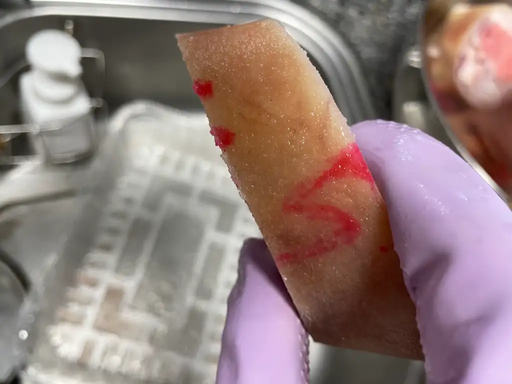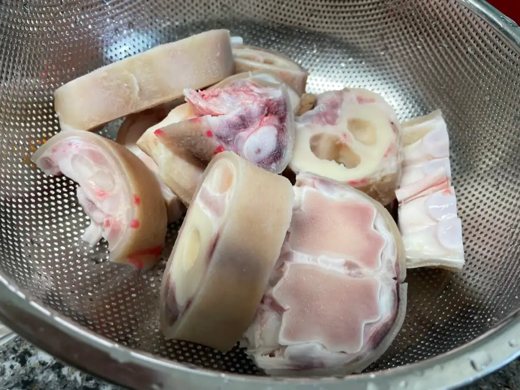 지방을 제거하고, 핏물을 뺀 후 혹시나 남아 있을지 모르는 균을 제거하고자 식초에 10분 정도 담가 두었습니다. 강아지 우족은 처음 만들어 보기 때문에 괜히 만들어서 우리 강아지에게 먹였다가 탈이라도 나면 너무 속상할 것 같아서 최대한 깔끔하게 만들고자 하였습니다. 해동 전 보다 한층 깨끗해진 우족의 모습입니다.