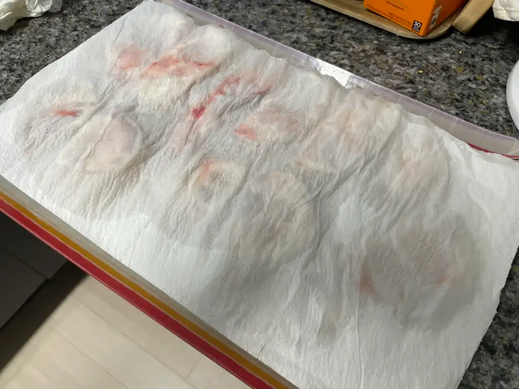 강아지 우족을 조금이라도 빨리 건조시키고 비린내가 나지 않도록 하기 위해서는 건조를 하기 전에 물기를 잘 제거해야 합니다. 여러 겹의 키친 타월을 이용해서 우족에 남아 있는 물기를 최대한 제거해 주었습니다. 강아지를 위한 음식을 만들고 있지만 사람도 먹을 수 있을 정도로 청결한 상태에서 조리를 해야 하기 때문에 정말 신경을 많이 쓴 것 같습니다.