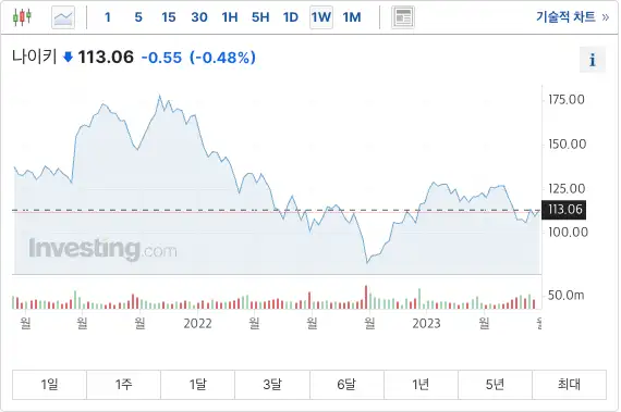 하지만 미국주식 나이키 종목의 주가 흐름은 시장 분위기와는 달리 침체를 벗어나지 못하고 있습니다. 그럼 제가 투자 방향을 틀어야 하는 걸까요? 아니면 조금 더 분석을 해서 투자 기회를 잡아야 하는 것일까요? 위기가 기회라는 말은 이럴 때 사용하는 것입니다. 주식 시장에서 주목을 받지 못하고 있을 때 야금야금 모아간다면 인플레이션이 해소되고 소비 심리가 살아날 때쯤 큰 수익을 얻을 수 있을 것이라고 생각합니다. 그래서 이 종목을 분석하게 되었습니다.