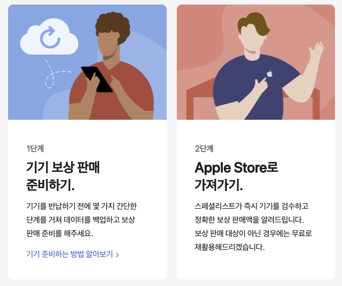 우선, 온라인을 이용한다면 보상 판매 예상액을 알아본 후 새 애플 제품을 선택하고 보상 판매 기기를 추가하고 결제하면 됩니다(만약, 새 제품을 구입하지 않는다면 계좌 입금을 받으면 됩니다.) 결제가 완료되면 반납할 제품에 있는 데이터를 모두 백업하고 삭제한 뒤 애플에서 이메일로 알려주는 반납 방법에 따라 반납하면 됩니다.