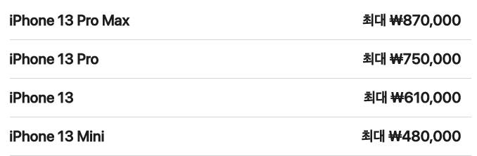 아이폰13 프로맥스는 비교적 최근에 나온 제품이기 때문에 최대 87만원을 보상받을 수 있습니다. 그리고 아이폰13 프로, 아이폰 13, 아이폰 13미니 순으로 75만원, 61만원, 48만원 상당의 크레딧을 받을 수 있습니다.