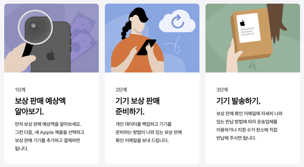 우선, 온라인을 이용한다면 보상 판매 예상액을 알아본 후 새 애플 제품을 선택하고 보상 판매 기기를 추가하고 결제하면 됩니다(만약, 새 제품을 구입하지 않는다면 계좌 입금을 받으면 됩니다.) 결제가 완료되면 반납할 제품에 있는 데이터를 모두 백업하고 삭제한 뒤 애플에서 이메일로 알려주는 반납 방법에 따라 반납하면 됩니다.