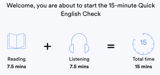 아래 그림을 통해서도 알 수 있듯이 리딩 7.5분, 리스닝 7.5분 총 15분 동안 테스트가 진행됩니다. 테스트를 진행하는 방법은 아래 링크를 통해 테스트 진행 사이트에 접속하여 'Start the test' 버튼만 누르면 리딩 문제부터 시작이 됩니다.
