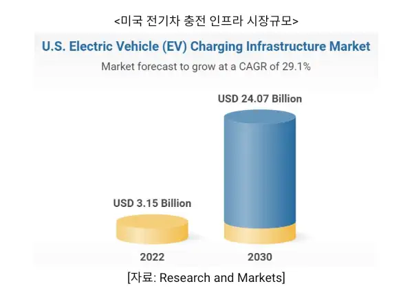 2020년부터 2026년까지 전기차 시장의 연평균성장률 50%를 상회할 것이라는 평가입니다. 미국의 전기차 비율은 2022년 기준 5.8%입니다. 하지만 조 바이든 대통령은 2030년까지 전기차의 비율을 50%로 높이겠다고 발표했고, 미국 환경보호국은 이 보다 더 높은 67% 까지 끌어올리겠다는 계획을 가지고 있습니다. 따라서, 매년 전기차와 충전 인프라는 기하급수적으로 늘어날 것으로 보입니다.