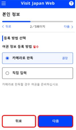 | 본인 정보 등록 방법 선택 화면 | 본인 정보 여권을 카메라로 판독하는 방법 |